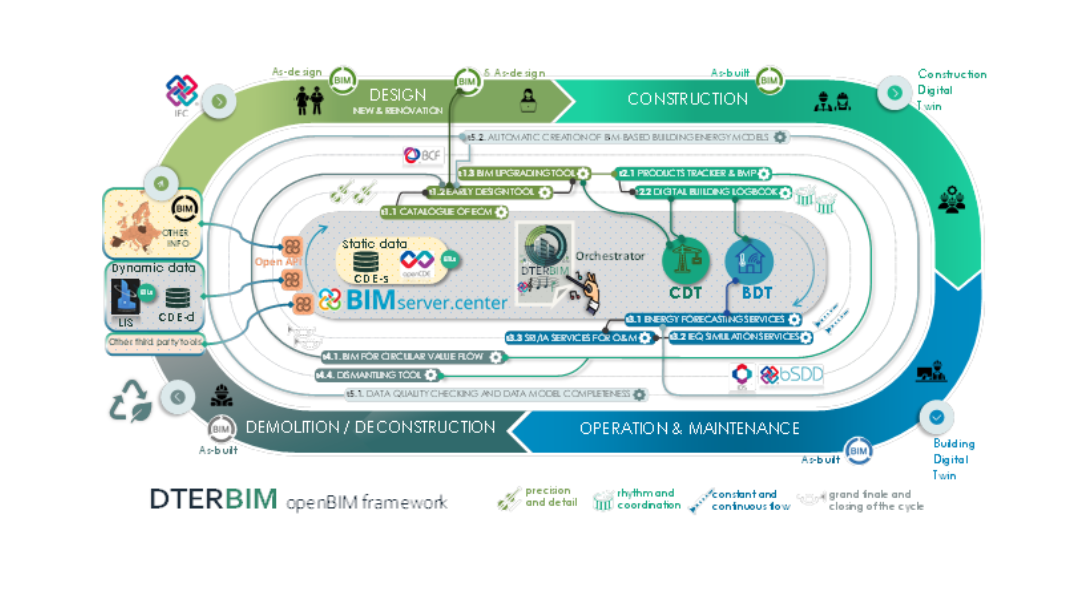 Para ello, DTERBIM desarrollará y demostrará el DTERBIM Toolkit, un conjunto integrado de herramientas digitales basadas en BIM, servicios impulsados por inteligencia artificial y gemelos digitales, coordinados a través de un marco openBIM que facilitará el intercambio de datos, la interoperabilidad entre soluciones y la colaboración entre agentes a lo largo de todo el ciclo de vida del edificio: diseño, construcción, operación, mantenimiento, deconstrucción y reutilización.